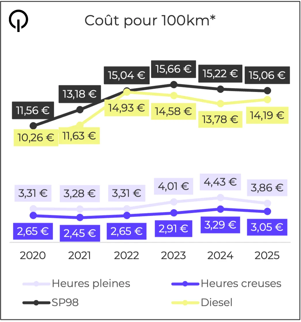 Les nouveaux tarifs réglementés de l’électricité sont entrés en vigueur depuis le 1er février 2025. Pour une consommation de 18 kWh aux 100 km en moyenne, le coût d’une recharge pour effectuer 100 km devrait se situer entre 3,05€ (heures creuses) et 3,86€ (heures pleines), grâce à la baisse en moyenne de 15% du tarif réglementé de l'électricité. Cette réduction permettra aux ménages d'économiser entre 69 et 165 euros annuellement, selon l'utilisation de leur véhicule électrique.
